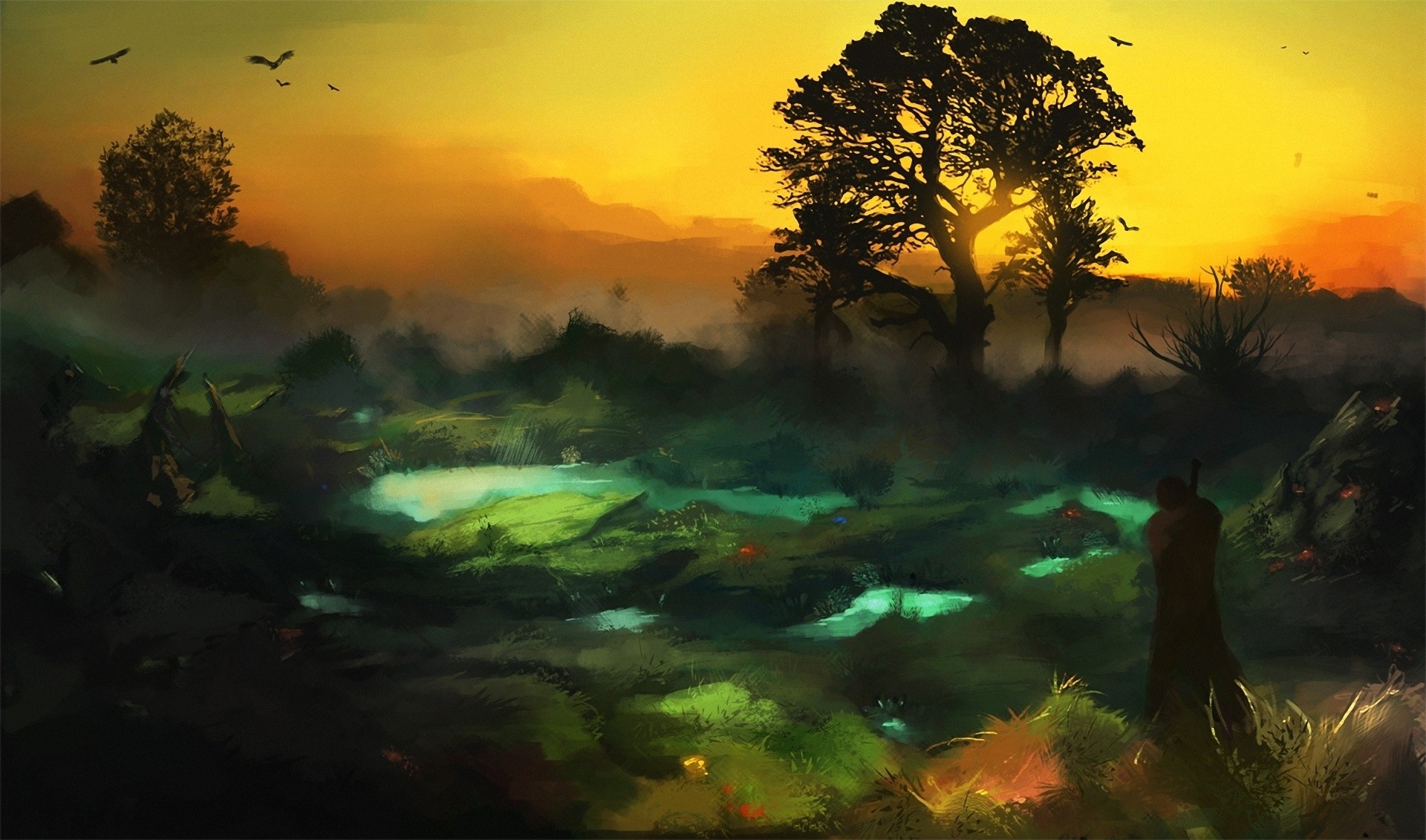Abstract Trees Birds silhouettes
