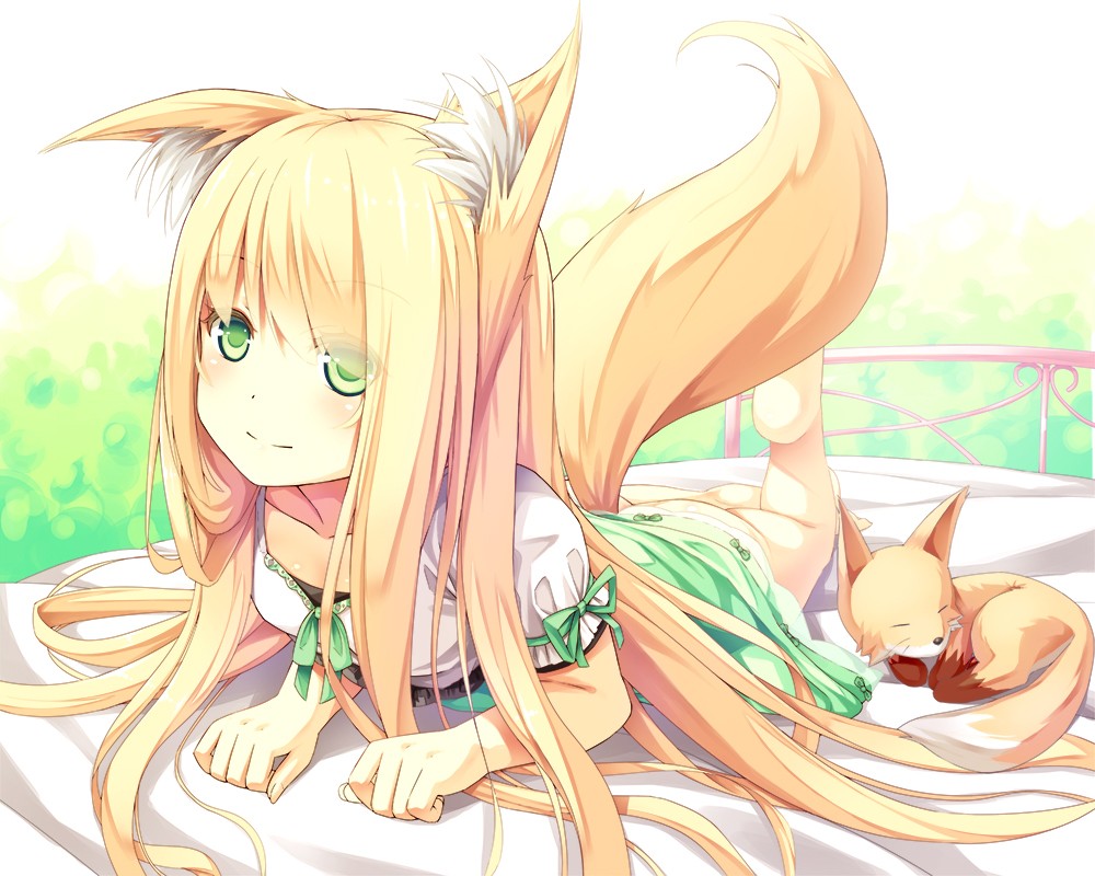 Beds blondes anime girls green eyes animal ears tails foxes
