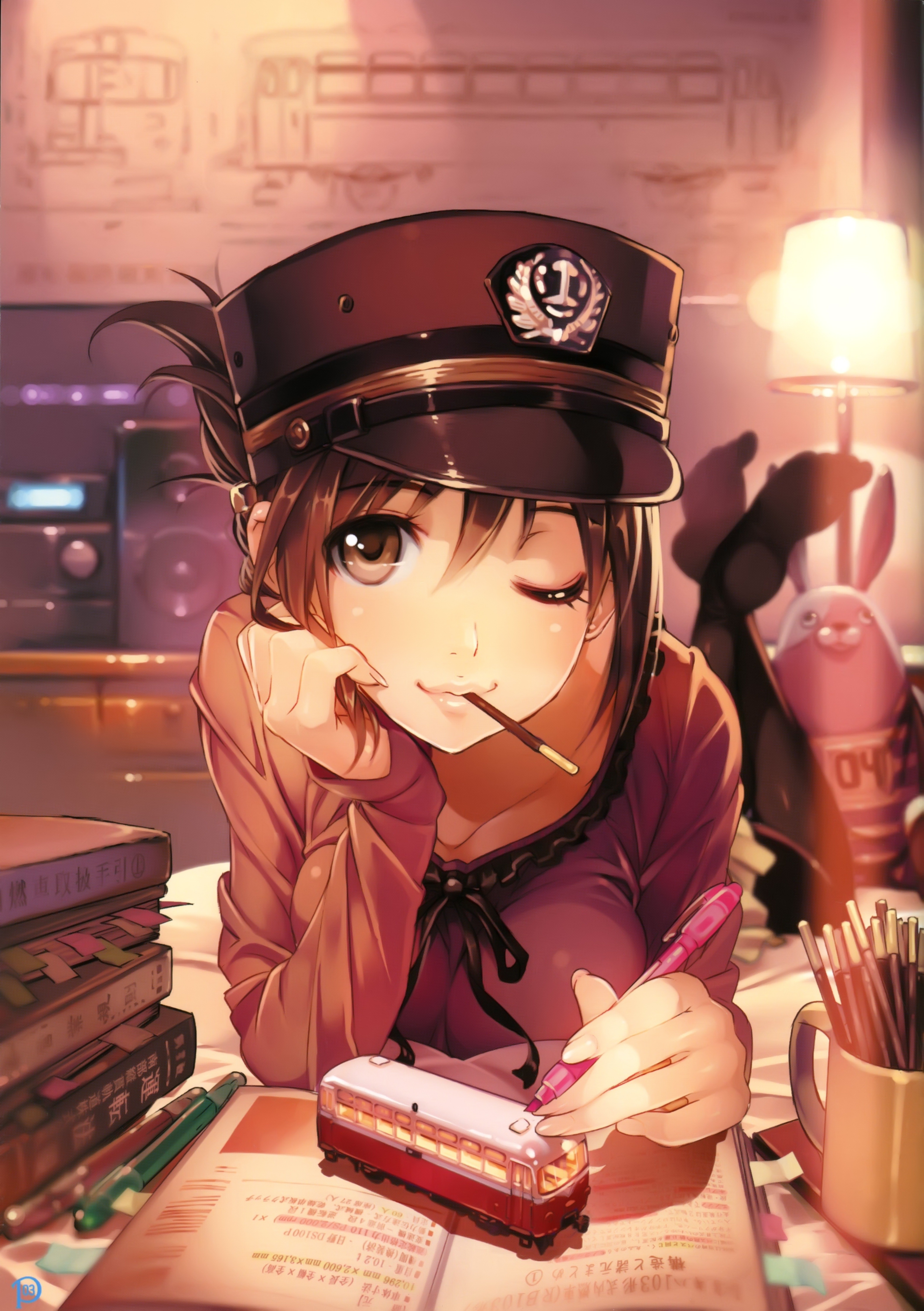 Books hats eating anime girls brown eyes brunettes wink lying