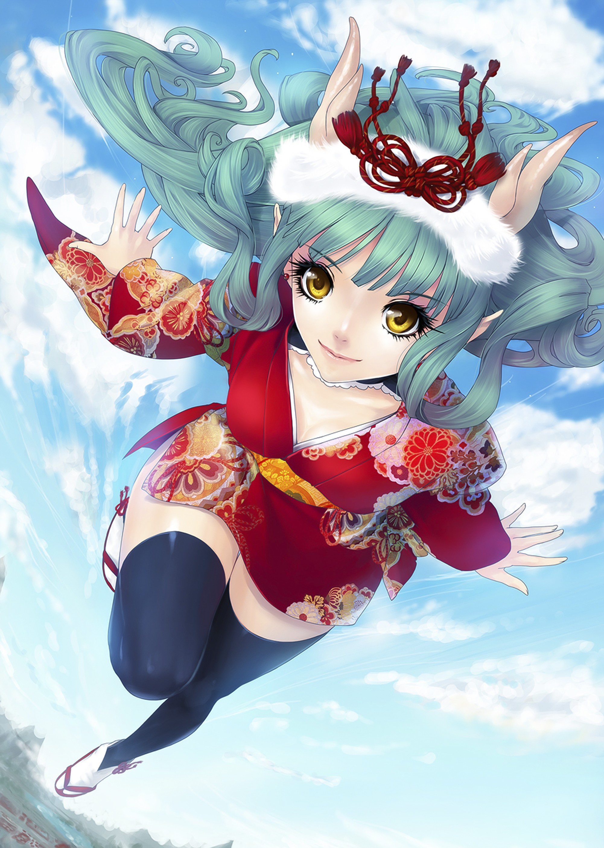 Dress horns stockings blue hair anime girls yellow eyes