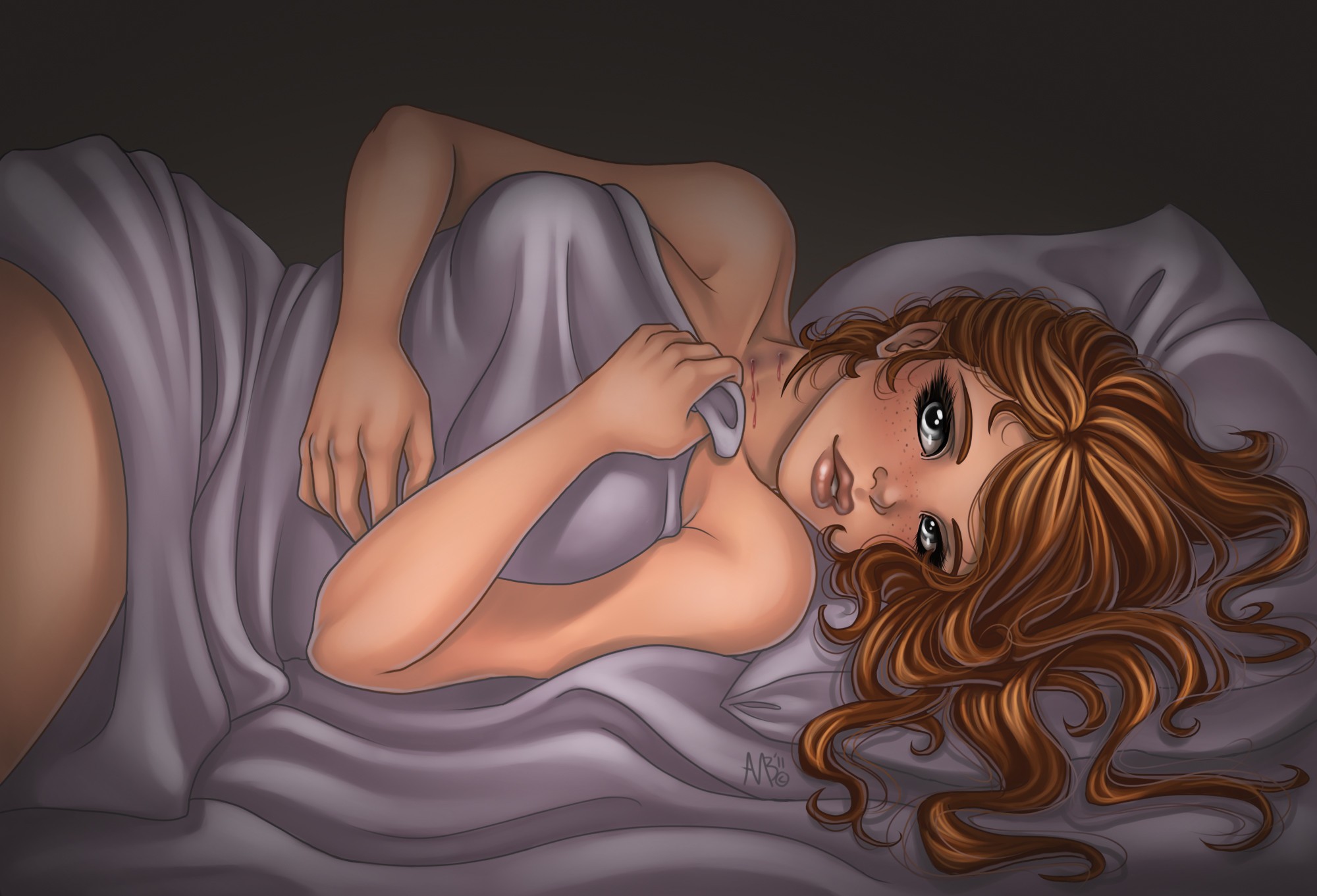 Eyes woman blanket beds faces lying down curly hair artwork