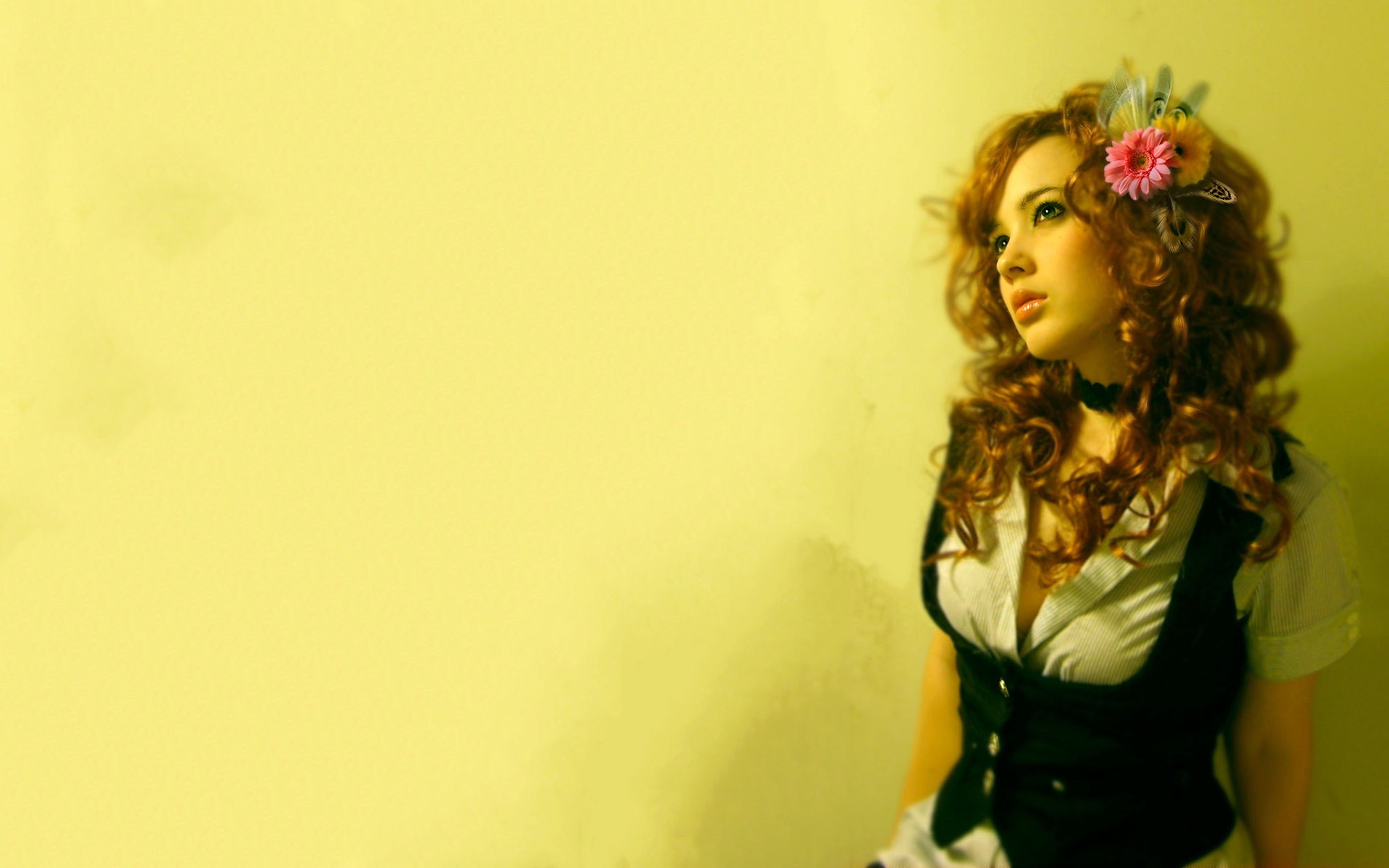 Flowers woman green eyes curly hair hair ornaments artwork
