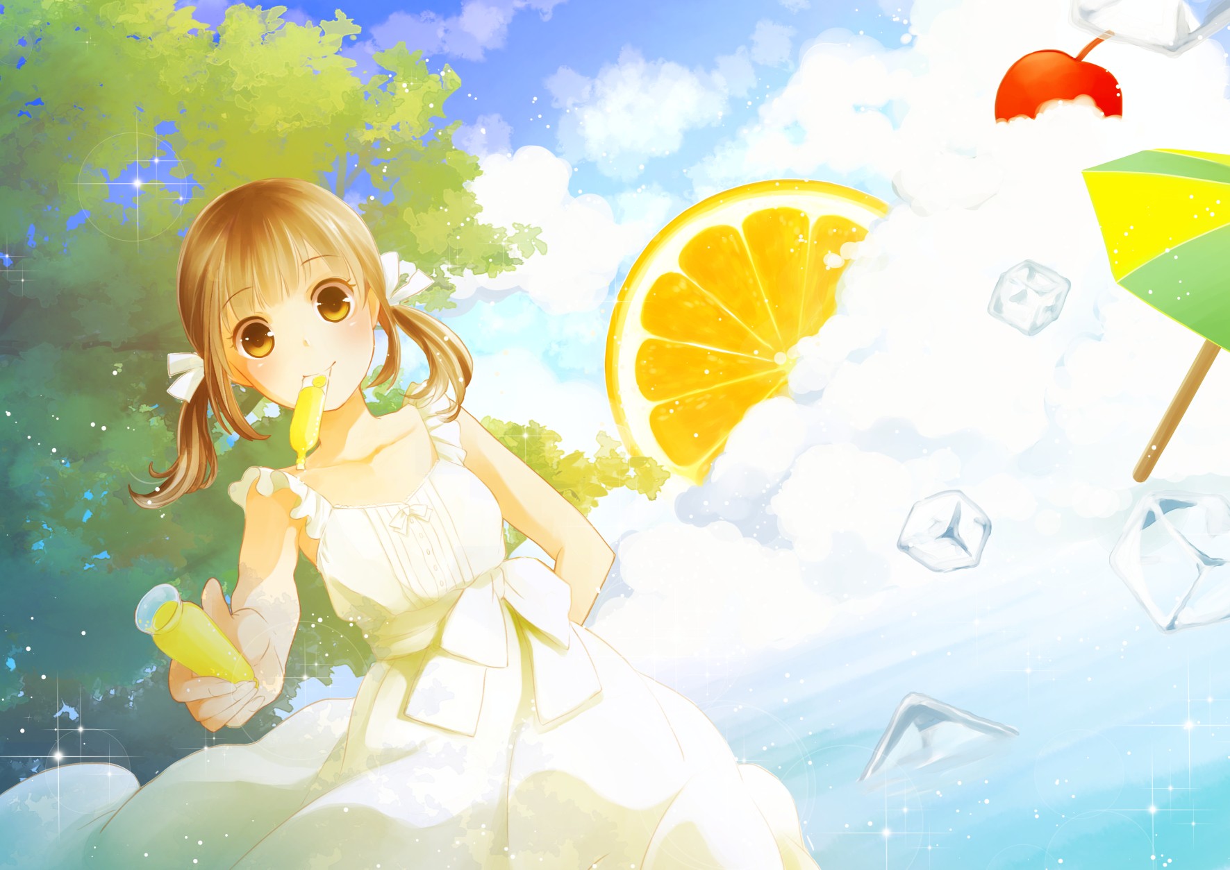 Food brown eyes short hair twintails summer dress Ahira Yuzu