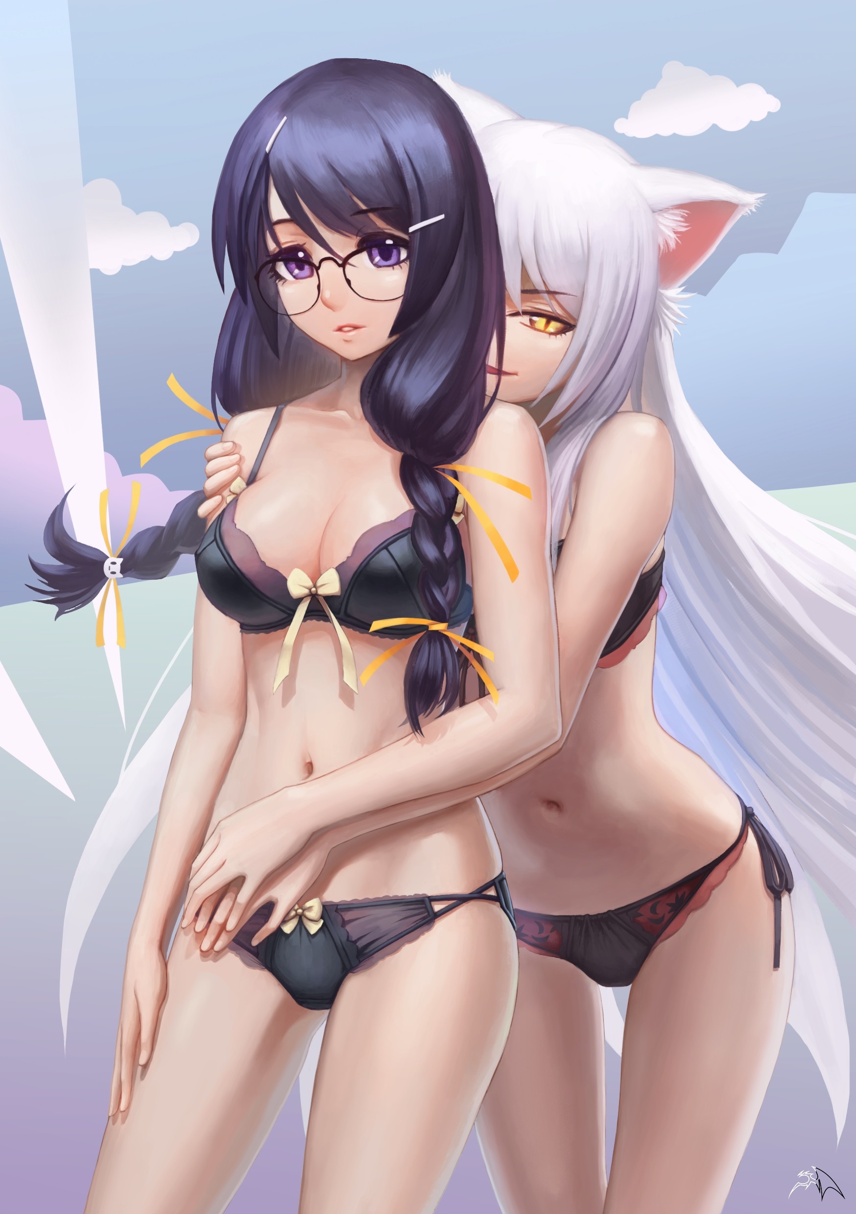 Glasses white hair long hair anime girls lingerie braids