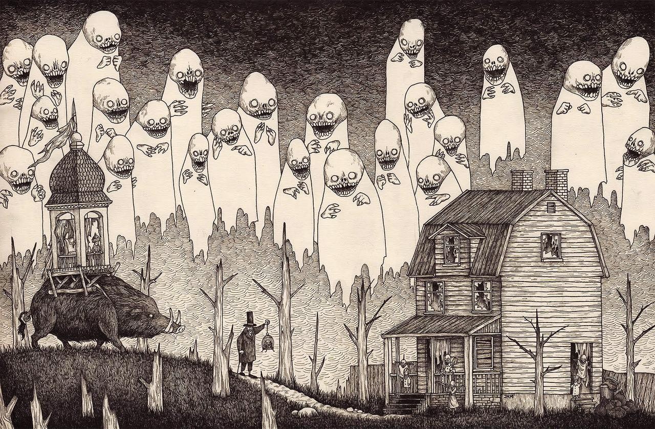 Landscapes black and white ghosts monochrome houses drawings