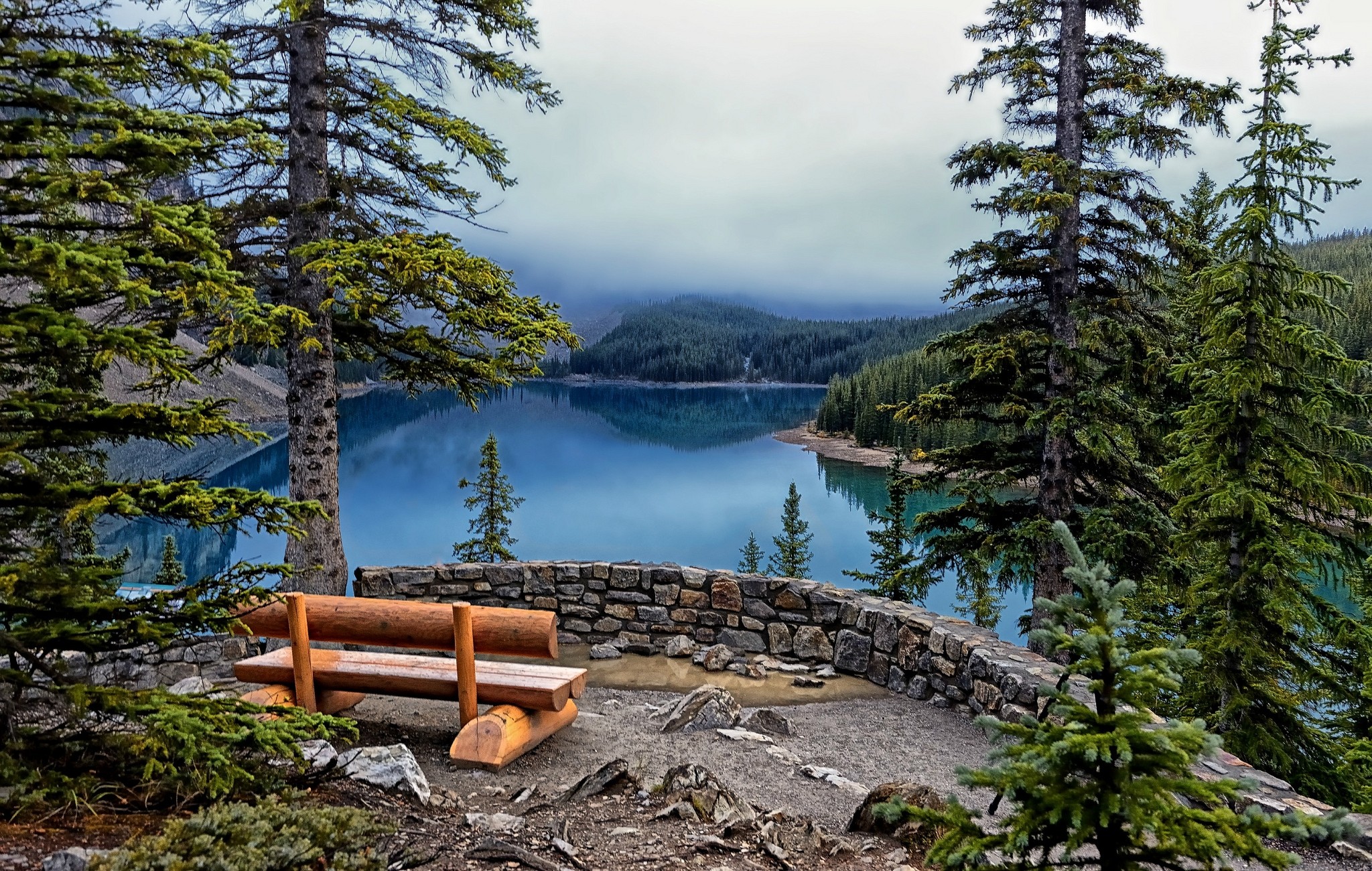 Landscapes fog nature Trees water blue Mountains Green bench