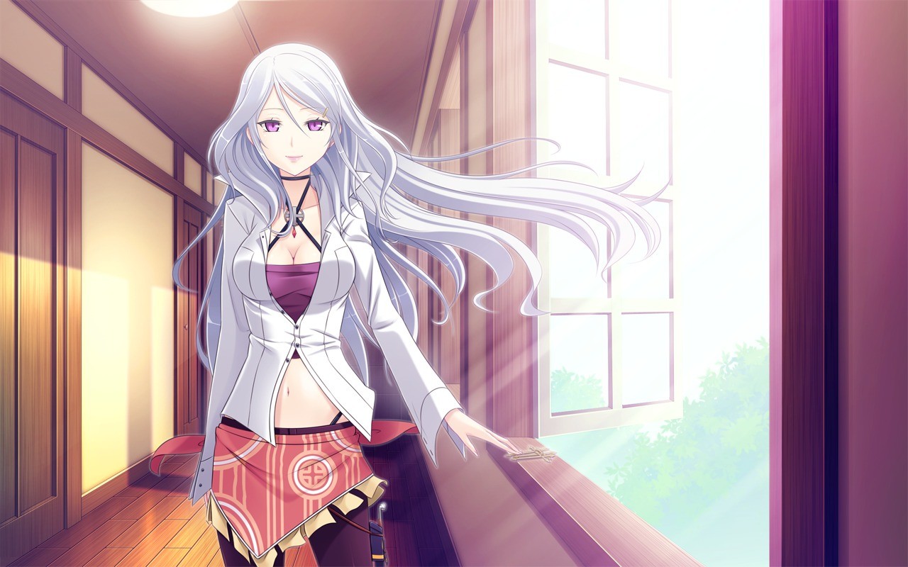 Long hair anime girls gray hair game cg purple eyes cleavage
