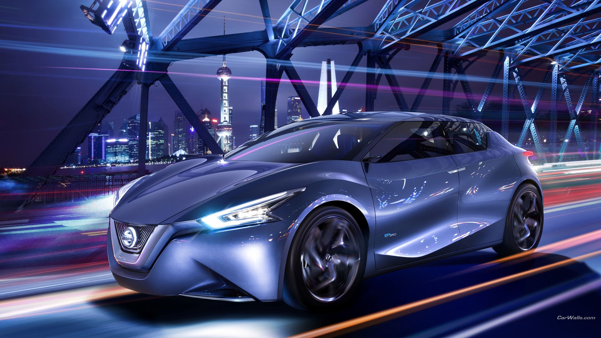 Night neon cars Nissan Shanghai Bridges headlights friend