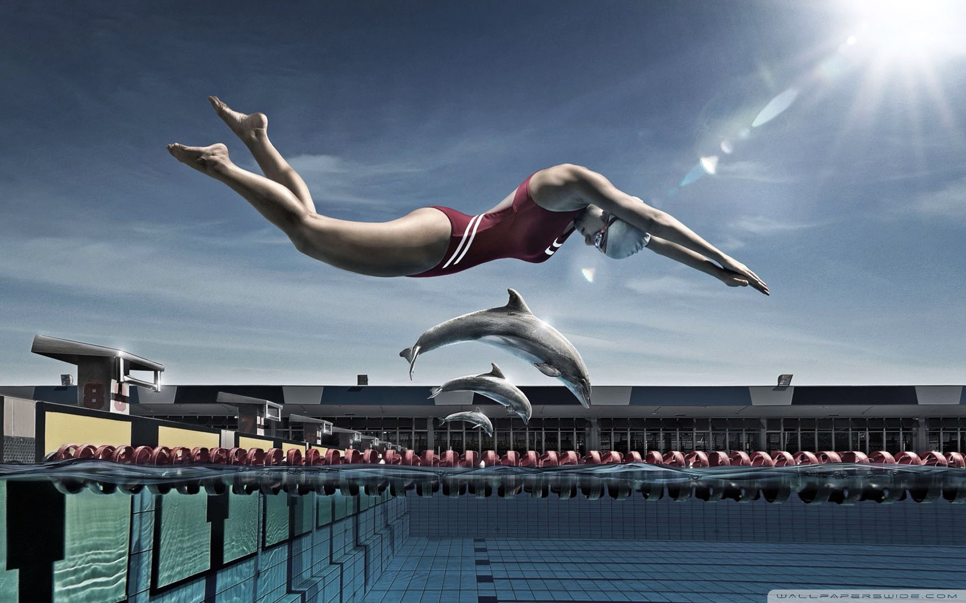 Swimming race Dolphins diving