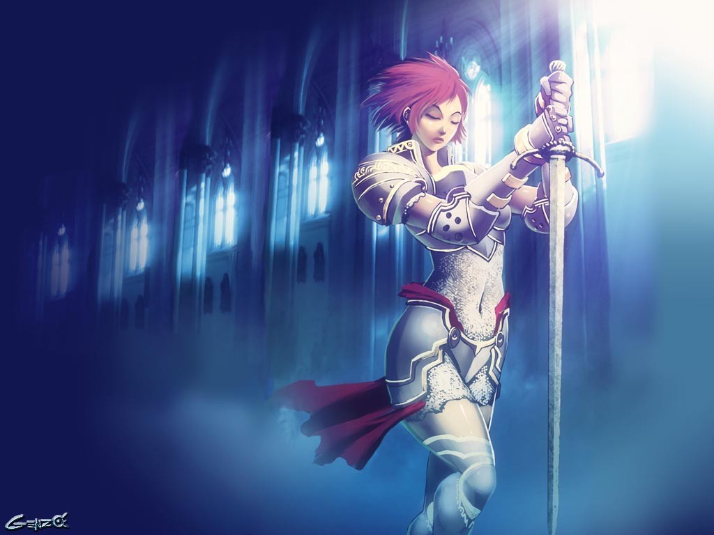 Swords closed eyes redheads soft shading god ray