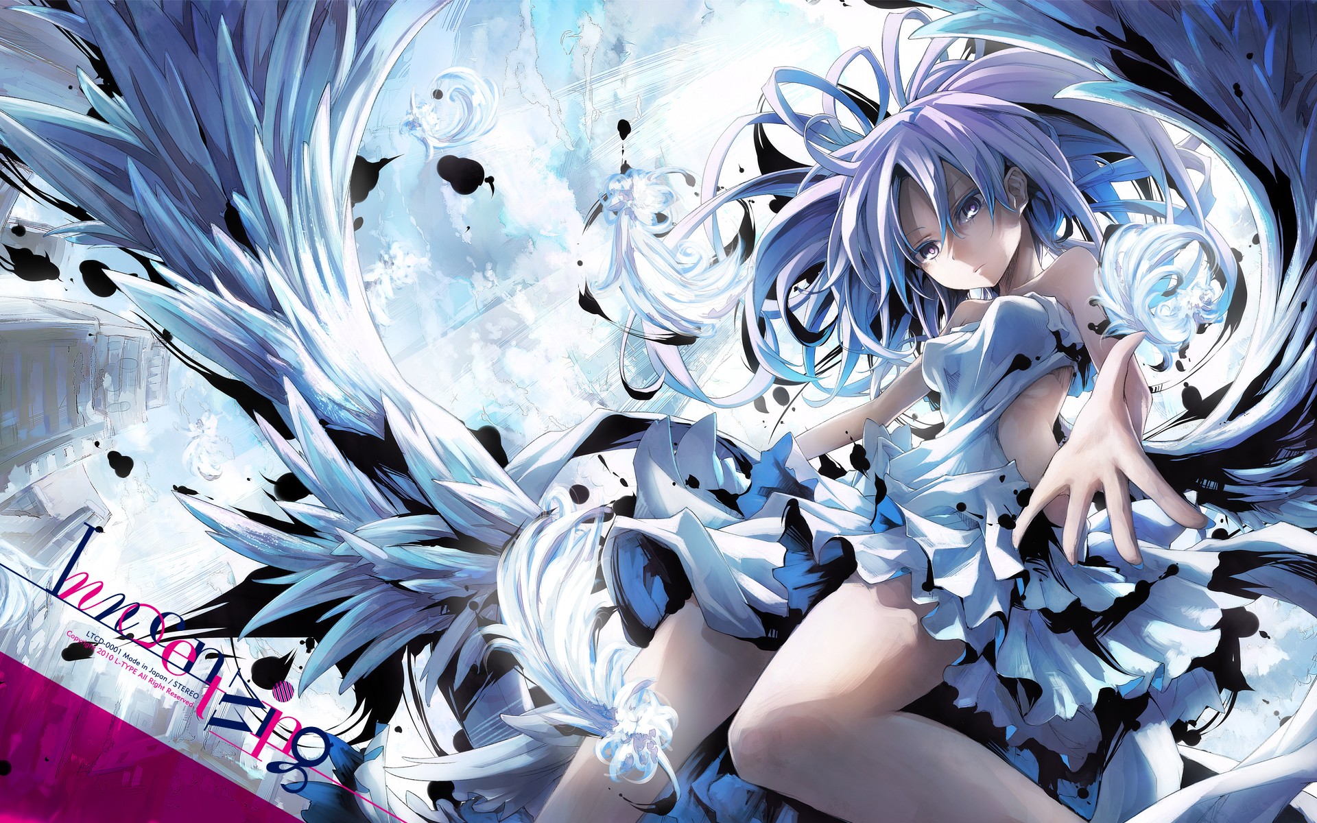 Text wings feathers dress blue hair long hair anime girls white