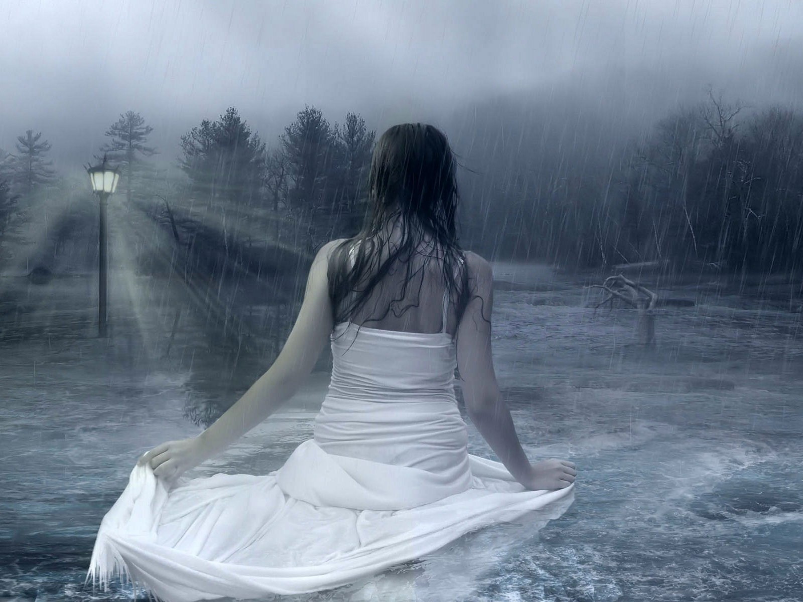 Trees rain woman twilight long hair brunettes back view white