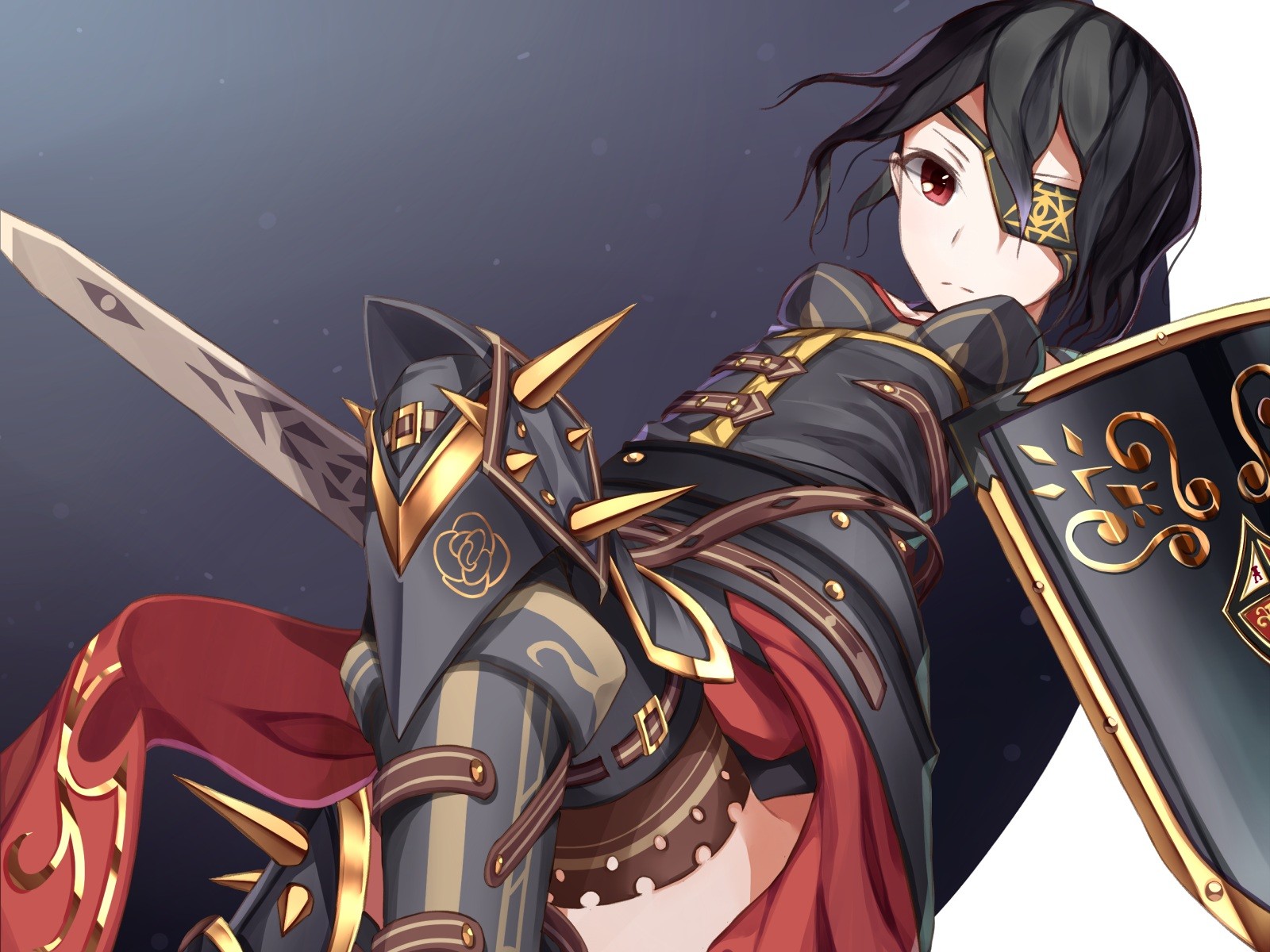 Weapons armor red eyes Swords shields anime girls black hair