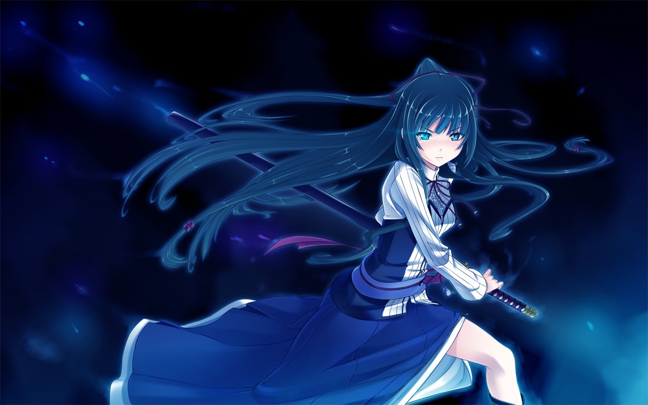 Weapons Katana blue hair anime girls blue eyes game cg Yamiyo