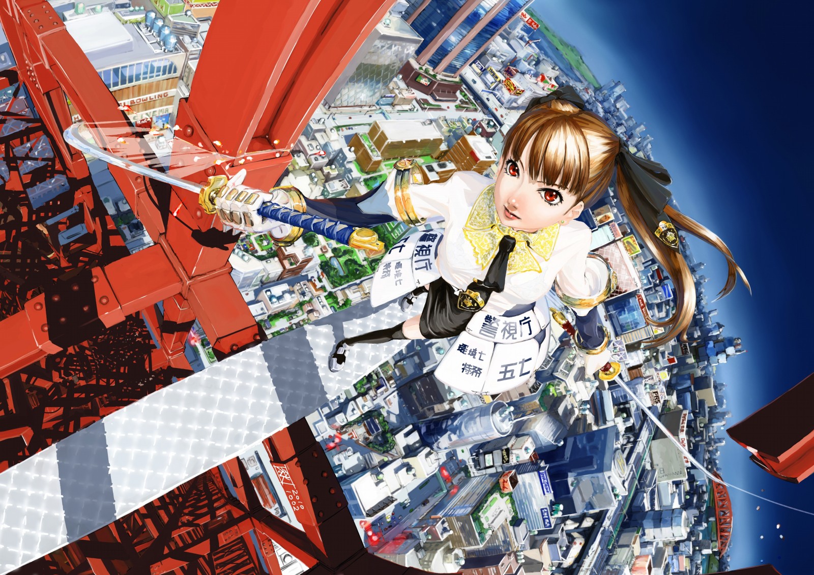 Weapons Katana brown red eyes gloves cities anime girls