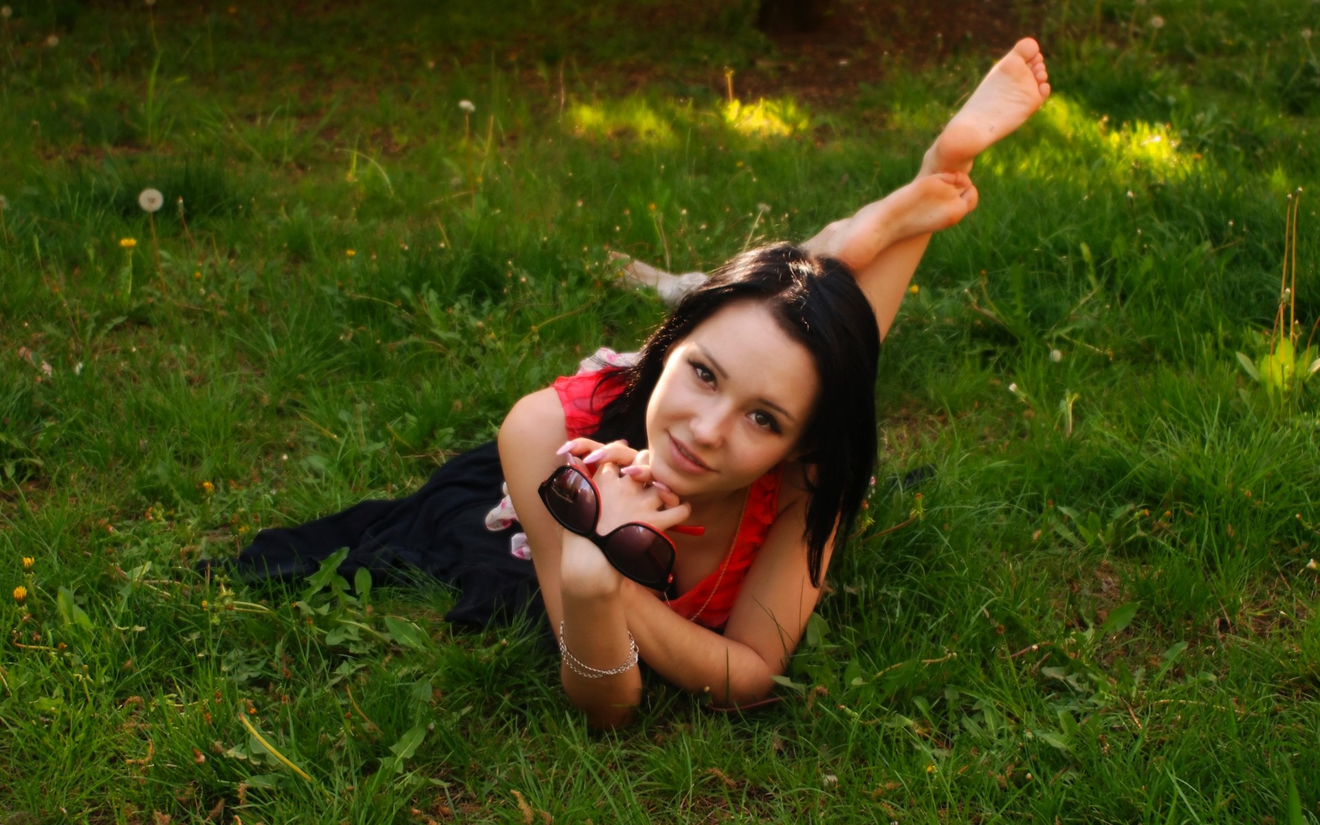 Woman brunettes models legs up laying on stomach girls in