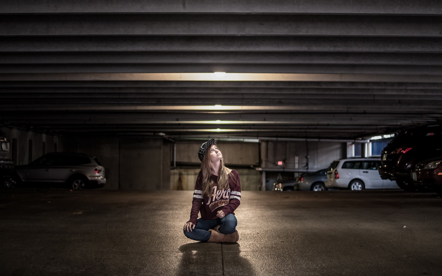 Woman cars jeans hats blondes models looking up kneeling