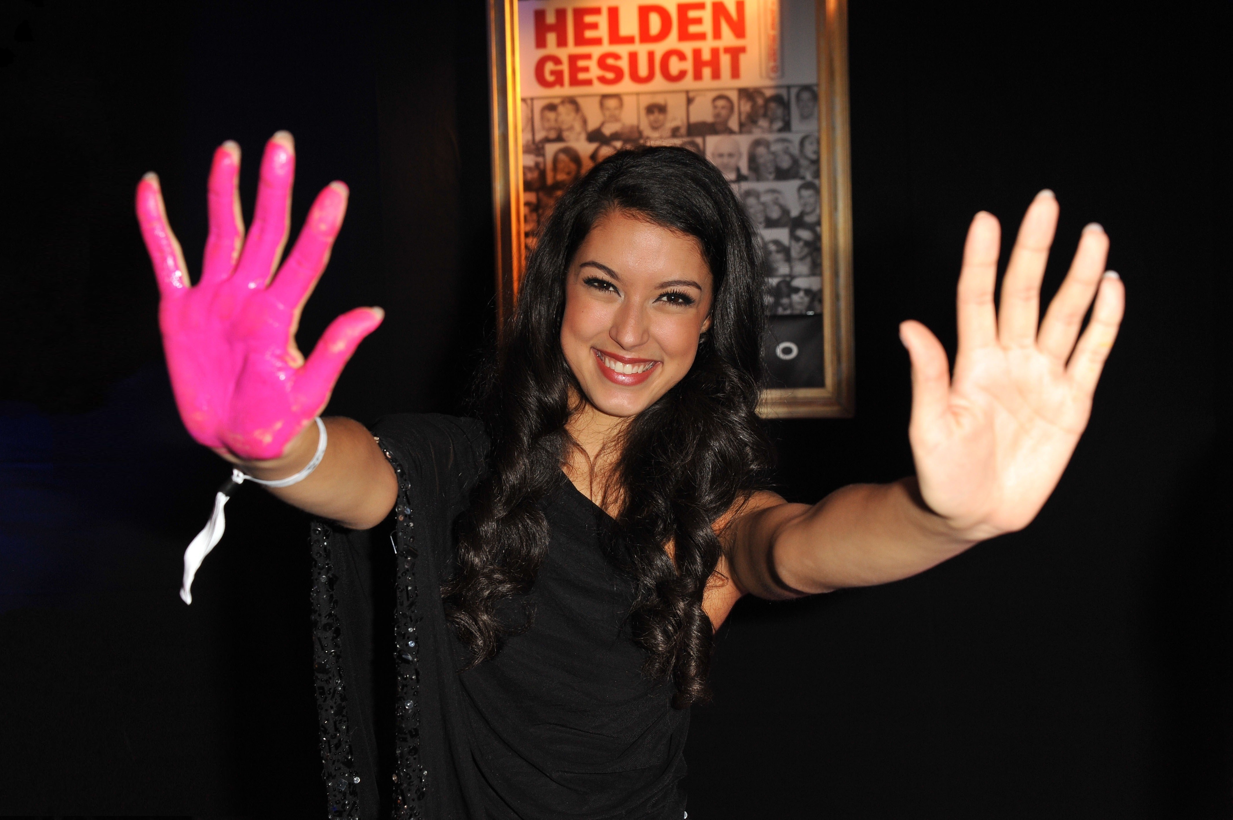 Woman hands smiling models black dress black hair Rebecca Mir