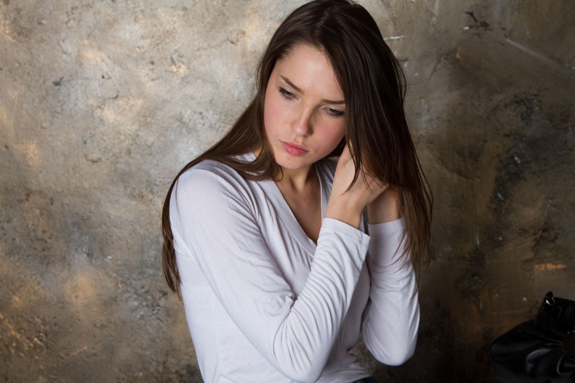 Woman looking down long hair brunettes Semmi A