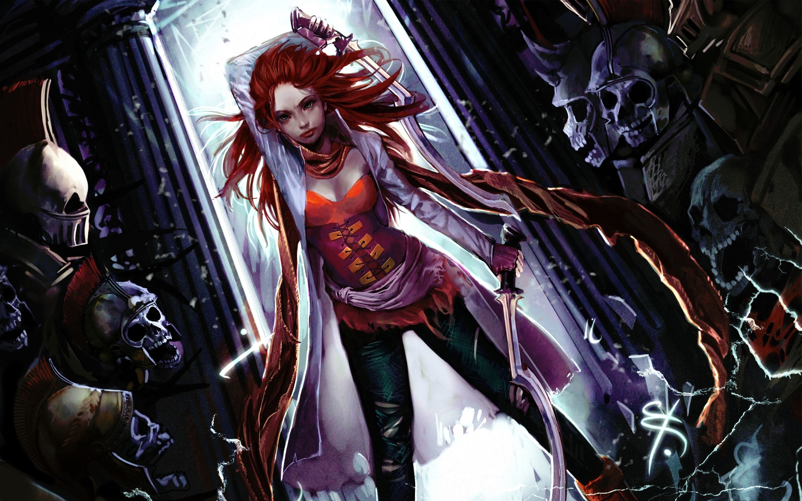 Woman weapons Swords skeletons corset redheads artwork genki-de